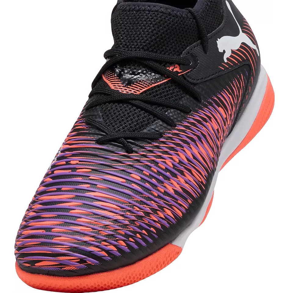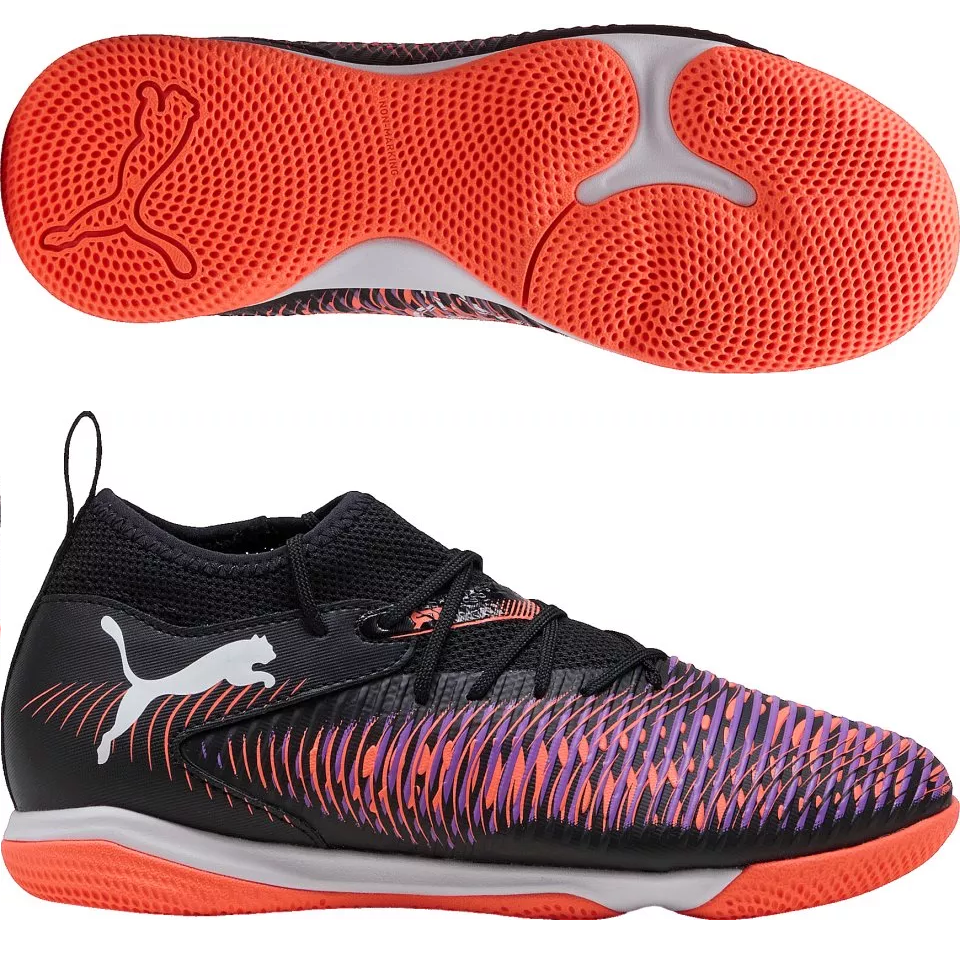 Introducing the FUTURE 8 MATCH IT + Mid Jr Indoor Soccer Shoes, designed for young football enthusiasts seeking style and performance on the indoor court. Crafted by Puma, these ankle boots are part of the prestigious Puma Unlimited Pack collection and feature a striking black colorway with vibrant orange and purple accents.