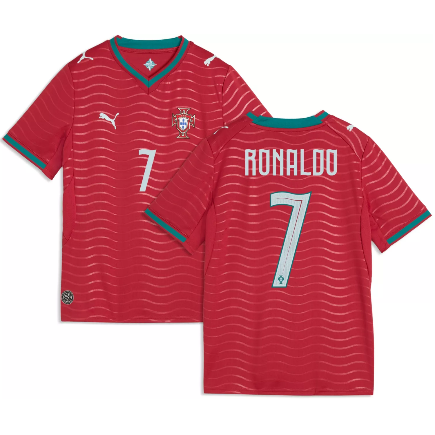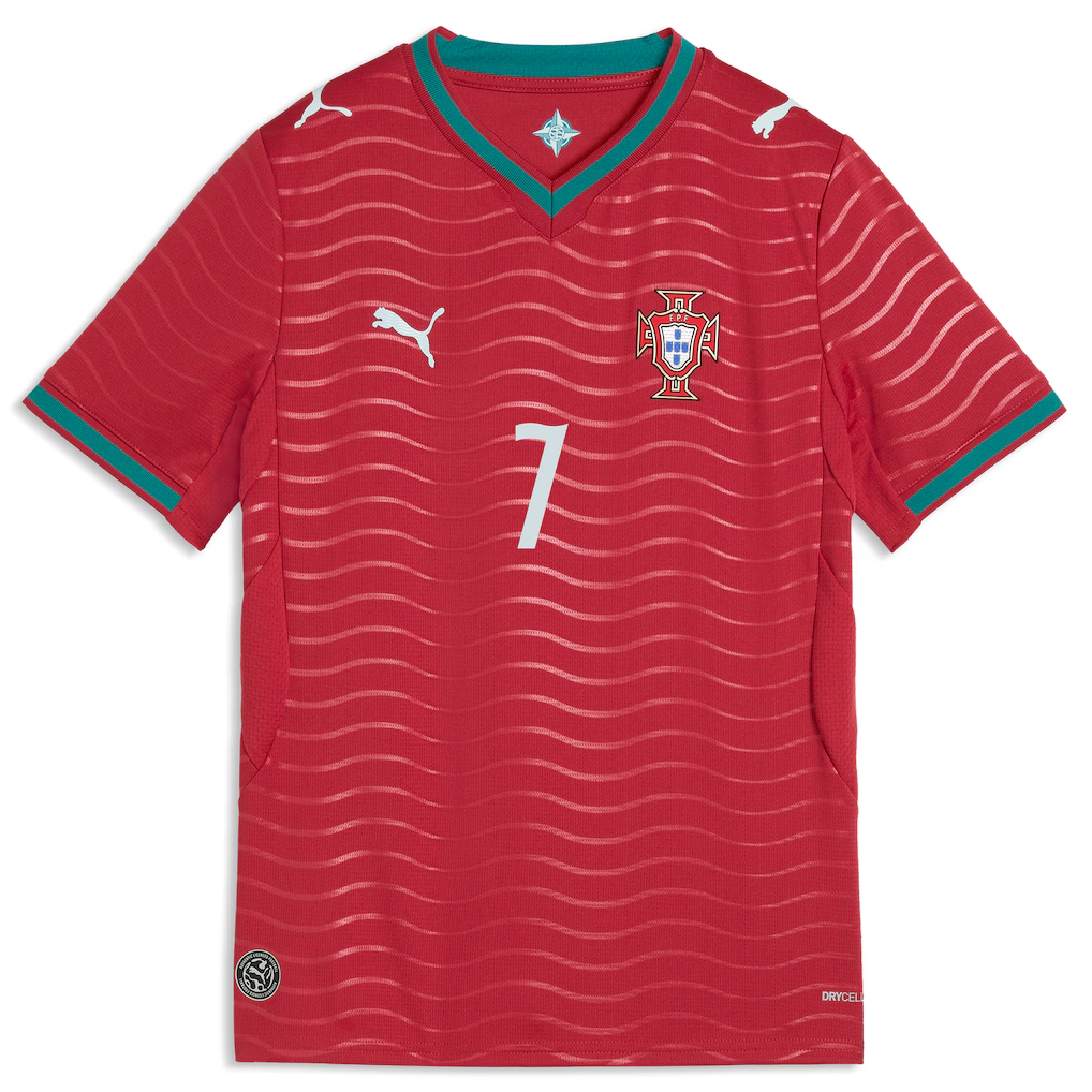 Get your young soccer prodigy ready to cheer on Cristiano Ronaldo and the Portugal National Team with this 2026 Home Jersey from Puma. This jersey replicates the one worn by the players during the 2026 FIFA World Cup and features a heat-sealed team graphic at the left chest. The dryCELL® technology draws sweat away from skin to keep you dry and comfortable, while the printed pattern and backneck taping add to the overall quality and comfort